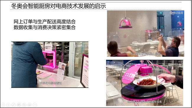 梁金萍教授和王志輝老師在《物流學(xué)》《電子商務(wù)概論》的緒論課中,以冬奧會(huì)服務(wù)機(jī)器人和全自動(dòng)的智慧餐廳為例,展示了京東物流機(jī)器人獨(dú)家“包攬”物資配送的出彩和智能廚房中的數(shù)據(jù)收集同消費(fèi)決策的緊密結(jié)合,讓學(xué)生感受到我國物流與電商領(lǐng)域的技術(shù)硬實(shí)力。