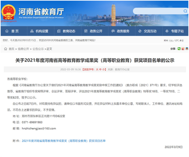 中新河南網(wǎng)3月18日電(潘奕辰) 根據(jù)《河南省教育廳辦公室關(guān)于做好2021年河南省高等教育教學(xué)成果獎(jiǎng)勵(lì)申報(bào)工作的通知》(教辦職成〔2021〕371號(hào))要求,經(jīng)省教育廳組織專家網(wǎng)絡(luò)評(píng)審、會(huì)議評(píng)審、答辯評(píng)審,鄭州電力高!“行業(yè)主導(dǎo)、平臺(tái)融合、三階遞進(jìn)”電力職業(yè)教育國(guó)際化辦學(xué)模式研究與實(shí)踐》獲2021年度高等教育教學(xué)成果獎(jiǎng)(高等職業(yè)教育)特等獎(jiǎng);《電力特色現(xiàn)代信息技術(shù)專業(yè)群“雙主體三階段四融通”人才培養(yǎng)模式研究與實(shí)踐》獲2021年度高等教育教學(xué)成果獎(jiǎng)(高等職業(yè)教育)二等獎(jiǎng)。