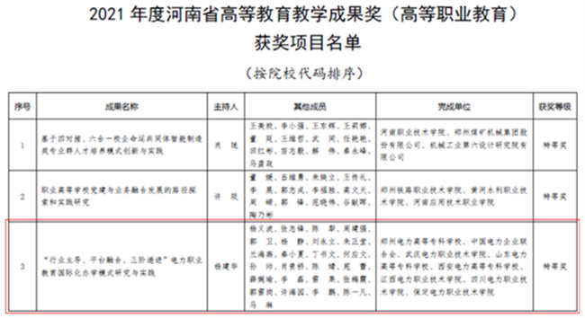 鄭州電力高專獲河南省高等教育教學(xué)成果獎(jiǎng)(高等職業(yè)教育)特等獎(jiǎng)