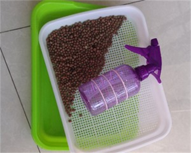 (2)24小時(shí)之后,把豆種撈出放在上層育苗盤里,用紙巾蓋住,一般家里的抽紙,卷紙都行,把盤放在陰涼處,不能曬太陽,用噴壺每天朝紙上噴水3-5次,把紙巾噴潮即可,不用太多!下層育苗盤里不能放水!一般兩天左右,你就會(huì)發(fā)現(xiàn)長(zhǎng)出類似白色的根!不用管它,繼續(xù)噴兩天!