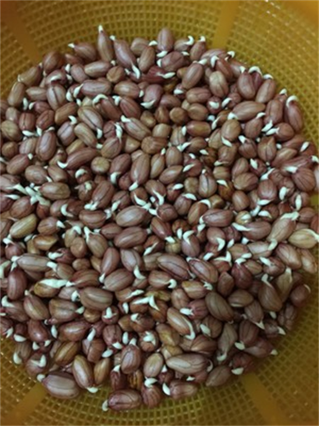(1)浸種與催芽:將選好的花生用清水浸泡半天至一天。把浸脹清洗后的花生直接裝入布袋,也可以放在底部有排水孔的盆內(nèi)遮陽催芽,,根據(jù)氣候條件,每天淋水2~3次,2~3天出白芽可以播種了。