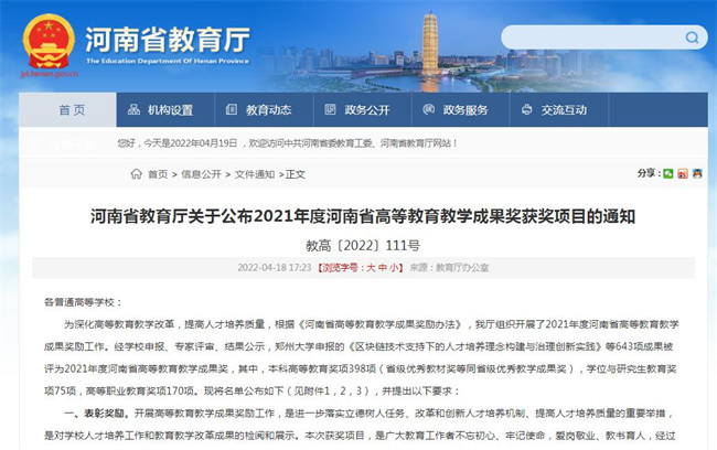 中新河南網4月21日電(崔源) 4月18日,河南省教育廳印發(fā)了《關于公布2021年度河南省高等教育教學成果獎獲獎項目的通知》(教高〔2022〕111號),河南交通職業(yè)技術學院推薦申報的9項教學成果全部獲獎,其中特等獎1項,一等獎5項,二等獎3項,獲獎等級與數量均創(chuàng)歷史新高,這是學校近年來在教學改革方面取得的又一重大成績!
