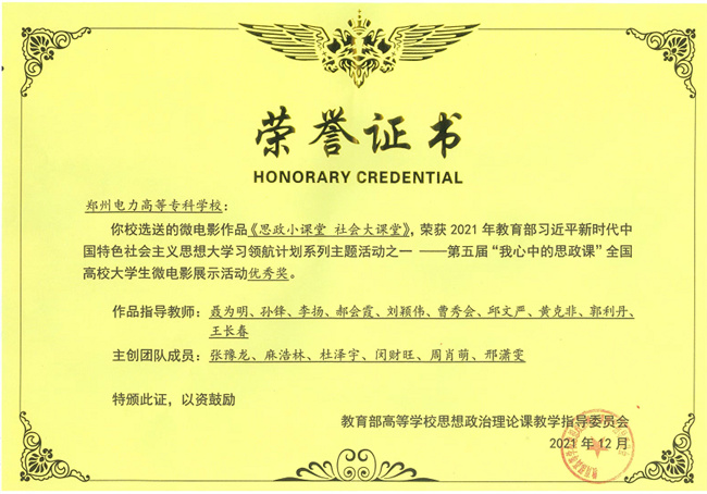 2021年5月,“我心中的思政課”——微電影評選活動拉開帷幕,鄭州電力高專黨委學(xué)工部、思政部和經(jīng)濟(jì)管理學(xué)院積極籌劃、認(rèn)真準(zhǔn)備,積極與百世快遞企業(yè)聯(lián)合拍攝微電影《思政小課堂 社會大課堂》。經(jīng)河南省教育廳層層篩選,鄭州電力高專選送的作品與鄭州大學(xué)、河南理工大學(xué)等11所高校的作品入圍第五屆“我心中的思政課”全國高校大學(xué)生微電影展示活動,最終榮獲全國優(yōu)秀獎。