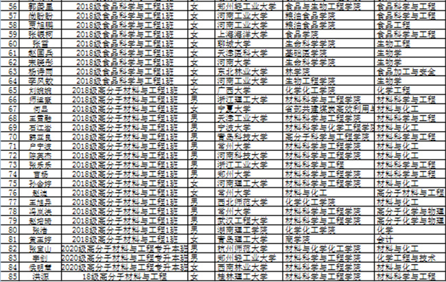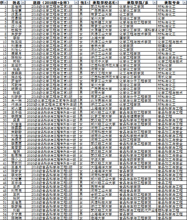 今年化工食品學(xué)院考研結(jié)果呈現(xiàn)出如下特點:一是該院共有260名本科畢業(yè)生,其中201人報名參加考試,92人通過國家線,上線率45.77%,85人被錄取,錄取率42.29%,再創(chuàng)新高;二是錄取院校質(zhì)量顯著提高,例如吉林大學(xué)、西南大學(xué)、河北工業(yè)大學(xué)、合肥工業(yè)大學(xué)、太原理工大學(xué)、上海大學(xué)、鄭州大學(xué)、石河子大學(xué)、東北林業(yè)大學(xué)、廣西大學(xué)、河南大學(xué)等國內(nèi)高水平院校錄取人數(shù)和比率均有大幅提高;三是涌現(xiàn)出2266、2246、1367等數(shù)個學(xué)霸宿舍和一個學(xué)霸班級——2020級食品科學(xué)與工程(專升本)一班28人報名參加考試,18人過線,15人被錄取,錄取率53.57%,學(xué)習氛圍更加濃厚。