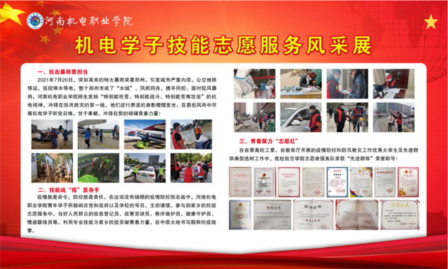 “機(jī)電學(xué)子技能志愿服務(wù)風(fēng)采展”集中展示了7·20鄭州及周邊地區(qū)特大暴雨期間,河南機(jī)電職業(yè)學(xué)院青年學(xué)子積極響應(yīng)黨和政府以及學(xué)校的號召,主動請纓,利用所學(xué)技術(shù)技能,發(fā)揚(yáng)“特別能吃苦、特別能戰(zhàn)斗、特別能克難攻堅(jiān)”的機(jī)電精神,沖鋒在防汛抗疫的第一線的先進(jìn)事跡。他們逆行奔波的身影熠熠發(fā)光,在勇?lián)L(fēng)雨中盡展機(jī)電學(xué)子聽黨召喚、甘于奉獻(xiàn)、沖鋒在前的磅礴青春力量!