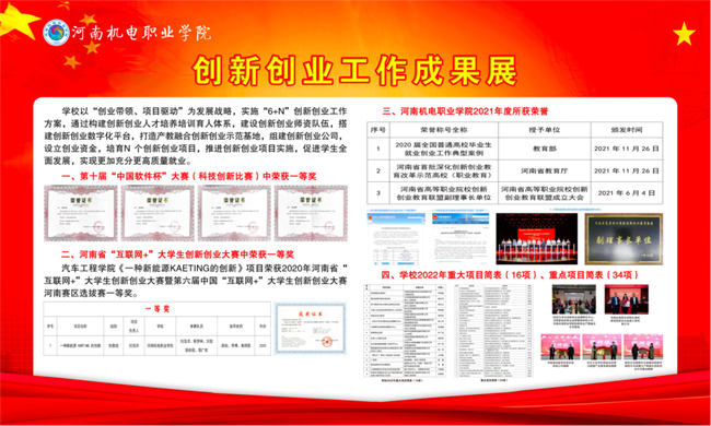 “創(chuàng)新創(chuàng)業(yè)工作成果展”主要展示了學(xué)校創(chuàng)新創(chuàng)業(yè)做法以及優(yōu)秀成果。學(xué)校以“創(chuàng)業(yè)帶領(lǐng)、項(xiàng)目驅(qū)動”為發(fā)展戰(zhàn)略,實(shí)施“6+N”創(chuàng)新創(chuàng)業(yè)工作方案,通過構(gòu)建創(chuàng)新創(chuàng)業(yè)人才培養(yǎng)培訓(xùn)育人體系,建設(shè)創(chuàng)新創(chuàng)業(yè)師資隊(duì)伍,搭建創(chuàng)新創(chuàng)業(yè)數(shù)字化平臺,打造產(chǎn)教融合創(chuàng)新創(chuàng)業(yè)示范基地,組建創(chuàng)新創(chuàng)業(yè)公司,設(shè)立創(chuàng)業(yè)資金,培育多個創(chuàng)新創(chuàng)業(yè)項(xiàng)目,榮獲第十屆“中國軟件杯”大賽(科技創(chuàng)新比賽)一等獎、河南省“互聯(lián)網(wǎng)+”大學(xué)生創(chuàng)新創(chuàng)業(yè)大賽一等獎、2020屆全國普通高校畢業(yè)生就業(yè)創(chuàng)業(yè)工作典型案例、河南省首批深化創(chuàng)新創(chuàng)業(yè)教育改革示范高校(職業(yè)教育)等多項(xiàng)榮譽(yù)稱號,激勵師生大膽進(jìn)行創(chuàng)新創(chuàng)業(yè),促進(jìn)學(xué)生全面發(fā)展,推動落實(shí)以創(chuàng)新創(chuàng)業(yè)為引領(lǐng)的線場模式,助力學(xué)校高質(zhì)量發(fā)展。