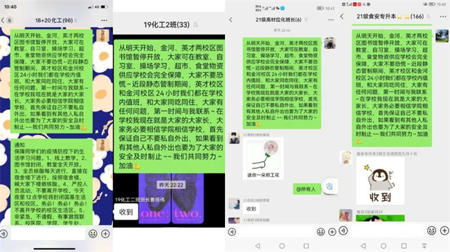 因事態(tài)緊急,為安撫學生的不安情緒,輔導員們竭盡全力做好校園封閉管理期間學生的思想引領工作,緊急召開線上班會,積極上好這場“大思政課”,教育學生“戰(zhàn)疫情,共前行”,引導學生“學有成,報家國”,讓正能量縈繞在學生周圍,堅定全體學生的戰(zhàn)“疫”信心。