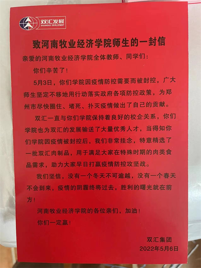 于是,鄭州雙匯食品有限公司,這家入選河南省人民政府農(nóng)業(yè)產(chǎn)業(yè)化重點(diǎn)龍頭企業(yè)的國(guó)人“大廚房”,一邊忙碌地生產(chǎn)、一邊給全校的師生寫了一封暖心的慰問信,鼓勵(lì)大家“疫情的陰霾終將過去,勝利的曙光就在前方!”。當(dāng)晚,公司將一箱箱凝聚著企業(yè)善意與愛心,體現(xiàn)企業(yè)抗擊疫情責(zé)任、擔(dān)當(dāng)、奉獻(xiàn)社會(huì)熾熱情懷的雙匯火腿腸,送到了學(xué)校。