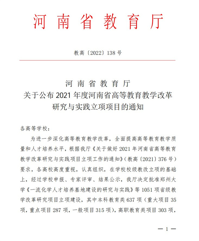中新河南網(wǎng)5月13日電(崔源) 近日,河南省教育廳發(fā)布了《關(guān)于公布2021年度河南省高等教育教學(xué)改革研究與實(shí)踐立項(xiàng)項(xiàng)目的通知》(教高〔2022〕138號),河南交通職業(yè)技術(shù)學(xué)院(簡稱“河南交院”)主持的8個項(xiàng)目獲批立項(xiàng),其中重點(diǎn)項(xiàng)目3個,一般項(xiàng)目5個,項(xiàng)目整體質(zhì)量持續(xù)提升。