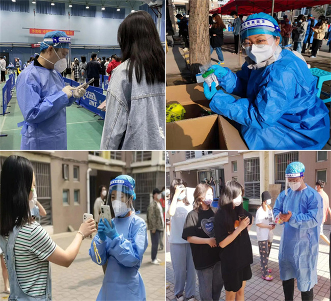 學(xué)院老師們穿著厚厚的防護(hù)服不論烈日寒風(fēng),在核酸檢測現(xiàn)場為同學(xué)們掃碼登記。