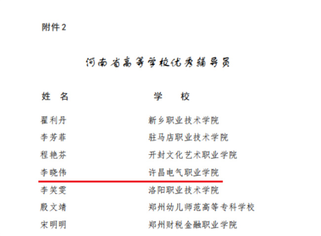 輔導(dǎo)員老師在平凡的崗位上奉獻(xiàn)者自己的青春,肩負(fù)著為黨和國家培養(yǎng)德、智、體、美、勞全面發(fā)展的專業(yè)人才的重任。李曉偉老師本次獲評省級“優(yōu)秀輔導(dǎo)員”是 許昌電氣職業(yè)學(xué)院輔導(dǎo)員隊伍建設(shè)的重要成果,將激勵全院輔導(dǎo)員見賢思齊,提高自身素質(zhì)和育人水平,探索和實踐學(xué)生工作的新途徑、新方法,進(jìn)一步促進(jìn)該校學(xué)生管理工作和思想政治教育工作再上新臺階。