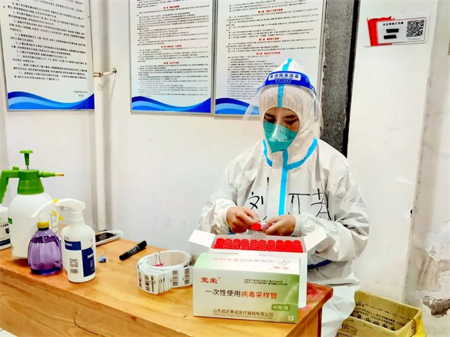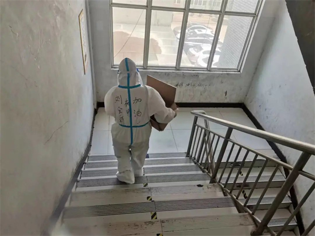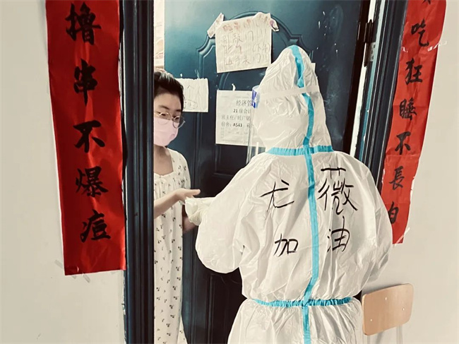 劉欣負(fù)責(zé)A棟宿舍樓值班和分餐任務(wù),為了給生病的學(xué)生送藥,匆忙趕路時(shí)不慎摔倒,她來不及處理傷口,第一時(shí)間把藥送到學(xué)生手中。介科懿負(fù)責(zé)一天兩次核酸檢測(cè),每天走的最早、回來的最晚。原本講壇上端莊優(yōu)雅的女教師,化身抗疫女戰(zhàn)士,在彼此的眼神中,她們看到了會(huì)心一笑的默契。原來,這不美的樣子真颯!