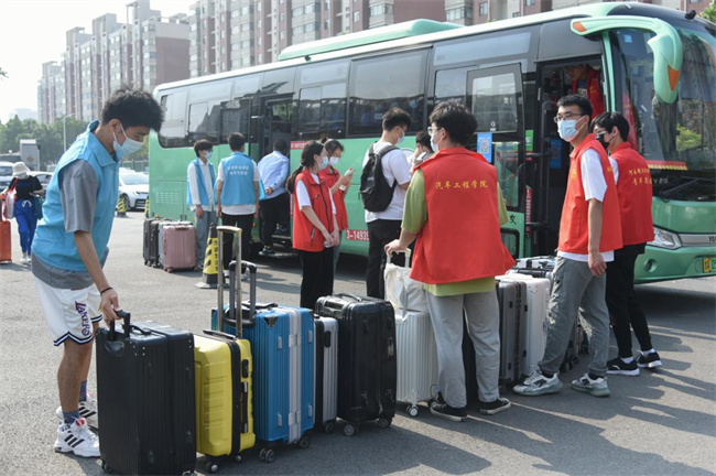 送站現(xiàn)場,離校學(xué)生完成離校信息填報(bào)后,在學(xué)生志愿者的指引下,來到早已等候的送站大巴前,掃描健康碼,經(jīng)體溫檢測、核酸證明和離校證明等查驗(yàn)無異常后,被送站志愿者護(hù)送到車上,安心舒適地踏上返鄉(xiāng)之旅。
