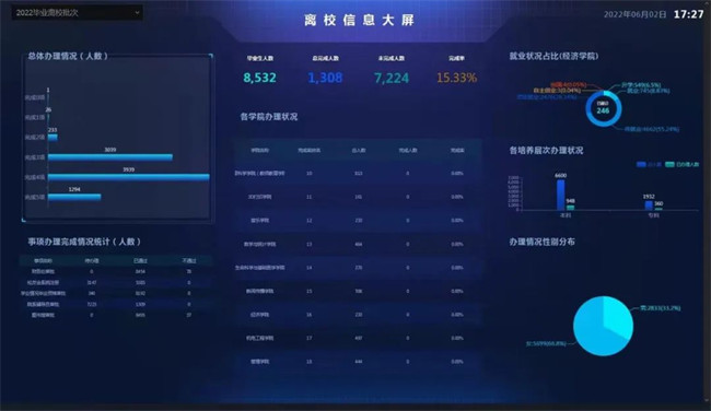 用上了大數(shù)據(jù),管理效果如何?在信息化管理中心信息系統(tǒng)部科,點開“新鄉(xiāng)學院一網(wǎng)通辦服務(wù)大廳”平臺的離校信息大屏,畢業(yè)生人數(shù)、總完成人數(shù)、未完成人數(shù)、完成率以及各學院辦理狀況一目了然。