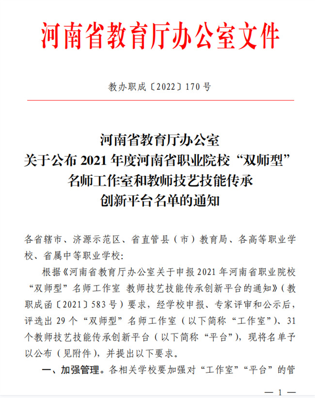 河南省職業(yè)院校教師技藝技能傳承創(chuàng)新平臺建設計劃是省教育廳貫徹落實《教育部財政部關于實施職業(yè)院校教師素質(zhì)提高計劃(2017-2020年)的意見》等文件精神,面向裝備制造、高新技術(shù)、傳統(tǒng)(民族)技藝等緊缺專業(yè),依托全省優(yōu)質(zhì)職業(yè)院校、應用型高校或職教師資培養(yǎng)培訓基地、科技型企業(yè)而進行的建設項目,是全面加強職業(yè)院校“雙師型”教師隊伍建設的重要舉措。