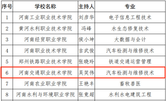 中新河南網(wǎng)6月10日電(王彬) 近日,河南省教育廳辦公室印發(fā)《關于公布2021年度河南省職業(yè)院校“雙師型”名師工作室和教師技藝技能傳承創(chuàng)新平臺名單的通知》,河南交通職業(yè)技術(shù)學院(簡稱“河南交院”)汽車學院吳笑偉教授主持建設的汽車檢測與維修技術(shù)專業(yè)工作室成功入選省級“雙師型”名師工作室名單。