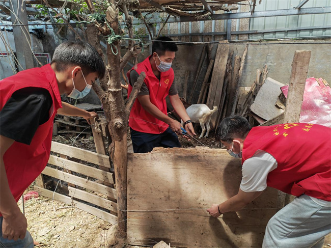 圖為志愿者幫助農(nóng)戶搭建羊圈