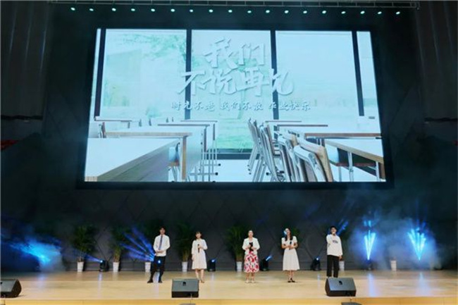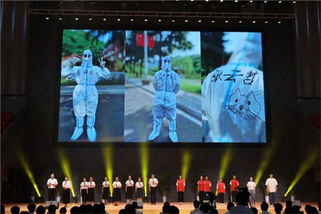 在節(jié)目展演環(huán)節(jié),師生們共同深情演唱《能不能不要說再見》《鳳凰花開的路口》等歌曲,勾起了畢業(yè)生對大學生活的無限回憶,深切表達對母校、師長、同窗的眷戀和感恩。歌曲《春風十萬里》《再揚帆》感人至深、催人奮進,激勵著畢業(yè)生們施展才干,實現(xiàn)夢想。朗誦節(jié)目《志愿者》以學院疫情防控志愿者為題材,彰顯出新時代青年義無反顧的奉獻精神。由畢業(yè)班輔導員創(chuàng)作的朗誦《輔導員寄語》,表達了老師對畢業(yè)生的不舍和期望,觸動著每一位畢業(yè)生的心,贏得現(xiàn)場陣陣掌聲。