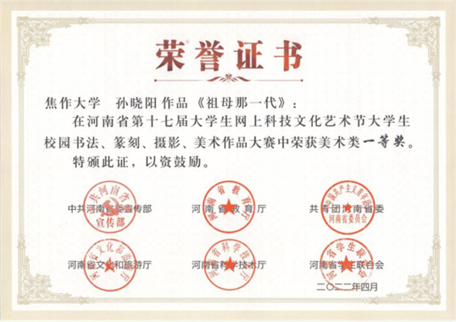 中新河南網(wǎng)7月5日電 近日,中共河南省委宣傳部、河南省教育廳、共青團(tuán)河南省委、河南省文化和旅游廳、河南省科學(xué)技術(shù)廳、河南省學(xué)生聯(lián)合會聯(lián)合下發(fā)了《關(guān)于發(fā)布河南省第十七屆大學(xué)生網(wǎng)上科技文化藝術(shù)節(jié)獲獎作品(個人)和優(yōu)秀組織單位名單的通知》(豫青聯(lián)字〔2022〕9 號),對河南省第十七屆大學(xué)生科技文化藝術(shù)節(jié)各項賽事進(jìn)行了表彰,焦作大學(xué)學(xué)生在比賽中喜獲佳績,其中一等獎1項,二等獎4項,三等獎15項。