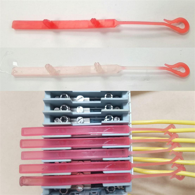 該產(chǎn)品利用溫感材料制成扣狀標簽,實現(xiàn)一線一扣,進行變電站二次端子的溫度安全檢測,超溫即變色,清晰明了。這項發(fā)明,解決了變電站二次側(cè)巡檢時排線密集、不易找出故障所在區(qū)域的問題,大大優(yōu)化巡檢流程,降低人員成本,被譽為“變電站端子排的溫感伴侶”。