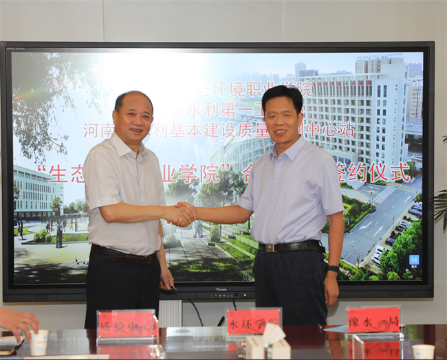 簽約儀式上,河南省水利基本建設(shè)工程質(zhì)量檢測中心站站長暢軍對中心站的技術(shù)資質(zhì)、人員組成和主要業(yè)績等進(jìn)行了介紹,表示將圍繞協(xié)議共建目標(biāo),依據(jù)共建基本原則,積極承擔(dān)相應(yīng)共建任務(wù),助力學(xué)校不斷創(chuàng)新人才培養(yǎng)模式、提升專業(yè)建設(shè)質(zhì)量、開發(fā)校企合作課程、打造實習(xí)實訓(xùn)基地、建設(shè)高水平教學(xué)團隊,共建好產(chǎn)學(xué)研服務(wù)平臺,竭力為我省水利教育事業(yè)與產(chǎn)業(yè)創(chuàng)新發(fā)展貢獻(xiàn)力量。姚斌、李廣慧、暢軍分別代表河南水利第一工程局、河南水利與環(huán)境職業(yè)學(xué)院、河南省水利基本建設(shè)工程質(zhì)量檢測中心站,簽訂“生態(tài)水利產(chǎn)業(yè)學(xué)院”共建合作框架協(xié)議書。