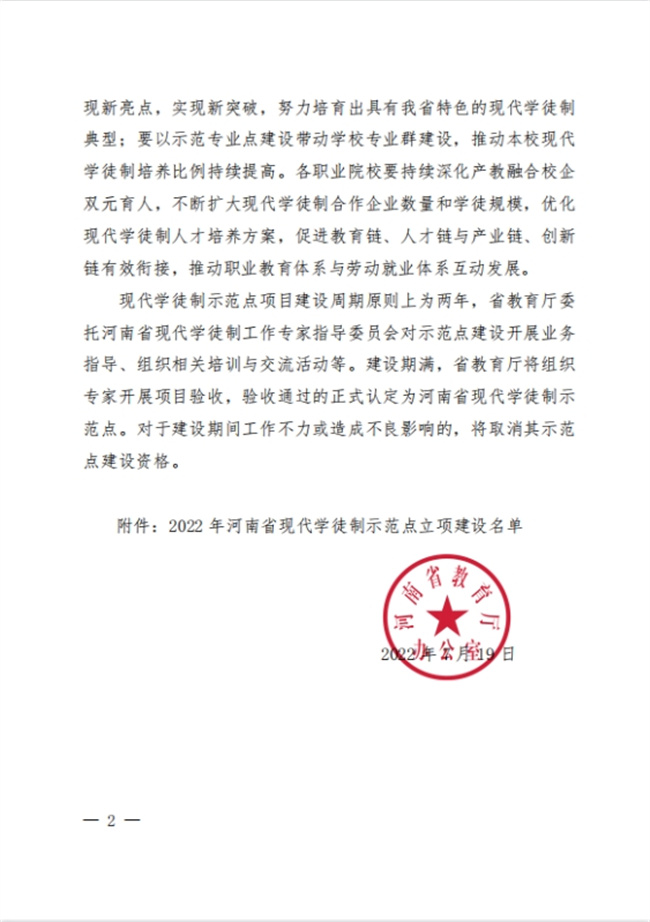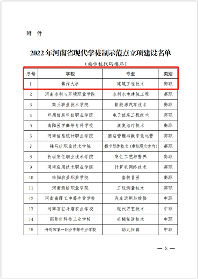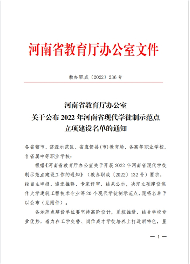該校土木建筑工程學(xué)院與企業(yè)合作積極探索“現(xiàn)代學(xué)徒制”人才培養(yǎng)模式改革,實(shí)行校企協(xié)同“雙導(dǎo)師”育人模式。土木建筑工程學(xué)院已與國隆科技股份有限公司和征云集團(tuán)有限公司聯(lián)合開展“雙元制”戰(zhàn)略合作,形成了“雙元制”教學(xué)基地并組建了“雙元制”訂單班。土木建筑工程學(xué)院與征云集團(tuán)有限公司簽訂了“共建征云智能建造學(xué)院”合作協(xié)議書以及“現(xiàn)代學(xué)徒制雙元制”合作協(xié)議,并制定了焦作大學(xué)征云智能建造學(xué)院章程。校企雙方根據(jù)技術(shù)技能型人才成長的規(guī)律和崗位的實(shí)際需要,共同研討論證、制定人才培養(yǎng)方案,設(shè)計(jì)實(shí)施教學(xué),組織考核評價(jià)等,形成了規(guī)范化、制度化、可操作化的具體實(shí)施體系。 此次獲批河南省現(xiàn)代學(xué)徒制示范點(diǎn)建設(shè)單位,是對該校現(xiàn)代學(xué)徒制人才培養(yǎng)的充分認(rèn)可。下一步,學(xué)校將結(jié)合“雙高工程”項(xiàng)目建設(shè)實(shí)際,繼續(xù)堅(jiān)持高階設(shè)計(jì)、系統(tǒng)推進(jìn),持續(xù)深化產(chǎn)教融合校企雙元育人,不斷擴(kuò)大現(xiàn)代學(xué)徒制合作企業(yè)數(shù)量和學(xué)徒規(guī)模,優(yōu)化現(xiàn)代學(xué)徒制人才培養(yǎng)方案,促進(jìn)教育鏈、人才鏈與產(chǎn)業(yè)鏈、創(chuàng)新鏈有效銜接,推動職業(yè)教育體系與勞動就業(yè)體系互動發(fā)展,服務(wù)區(qū)域經(jīng)濟(jì),著力打造特色。以點(diǎn)帶面,結(jié)合學(xué)校專業(yè)優(yōu)勢,持續(xù)深化產(chǎn)教融合校企雙元育人,穩(wěn)步擴(kuò)大現(xiàn)代學(xué)徒制合作企業(yè)數(shù)量和學(xué)徒規(guī)模,全面推進(jìn)學(xué),F(xiàn)代學(xué)徒制工作,努力建設(shè)成具有河南特色的現(xiàn)代學(xué)徒制示范學(xué)校。