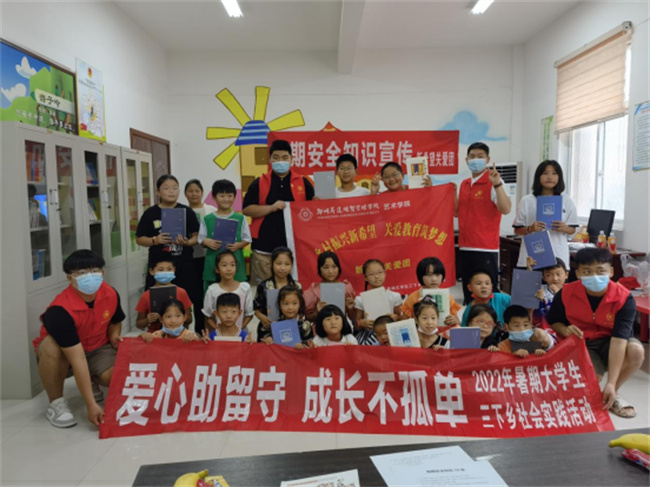 在新鄉(xiāng)市封丘縣,2020級環(huán)境設(shè)計專業(yè)同學(xué)以“喜迎二十大、永遠跟黨走、奮進新征程”為主題成立了“新希望關(guān)愛團”實踐團隊。7月22日至23日,輔導(dǎo)員魏雙雙老師帶領(lǐng)邵飛陽、齊萌萌、溫淇、高嘉璐、謝京宸等“新希望關(guān)愛團”成員在李莊鎮(zhèn)臨河小區(qū)留守兒童之家開展了關(guān)愛留守兒童活動。“新希望關(guān)愛團”成員首先結(jié)合具體案例和少年兒童認知特點,就防溺水、防暴雨洪澇、防高溫中暑以及日常的防火防電、交通安全、疫情防控等開展了生動的宣講,隨后帶領(lǐng)小朋友們做游戲、學(xué)唱歌、練手勢操。團隊成員還向孩子們贈送了文具、水果、牛奶等禮物,分享了大學(xué)生活,鼓勵孩子們努力學(xué)習(xí),長大后報效祖國。