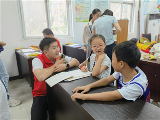 “新希望關(guān)愛團”志愿者與留守兒童談心
