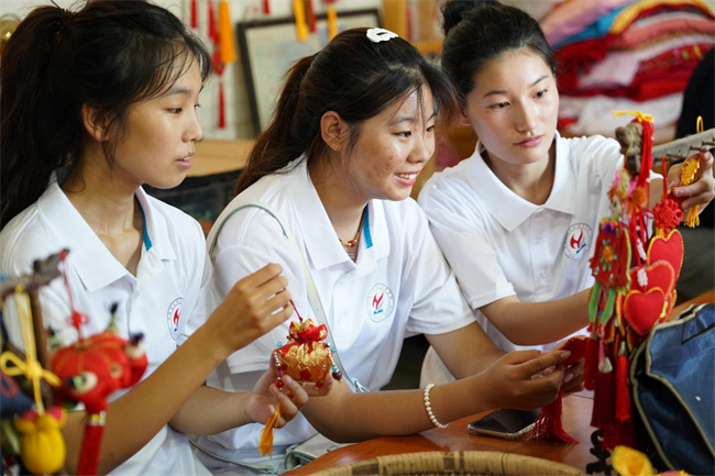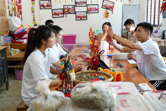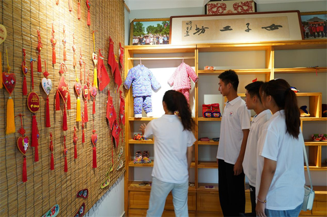 圖為實踐團成員在女子工坊了解學習中草藥香包、虎頭鞋、剪紙等鄉(xiāng)村傳統(tǒng)民間非遺技藝項目和產(chǎn)品。王宛玲 攝