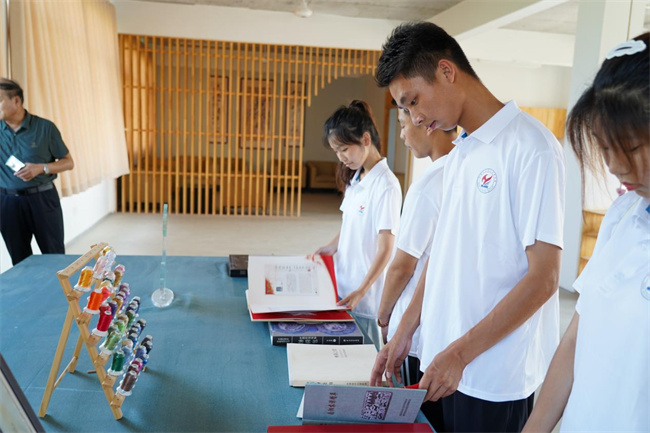 圖為實踐團成員在非遺體驗館翻閱《非物質(zhì)文化遺產(chǎn)名錄》,了解、學習非遺項目和非遺文化。王宛玲 攝