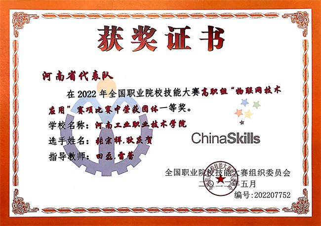 中新河南網(wǎng)8月30日電(劉天恒) 捷報頻傳,喜訊連連。8月25日,2022年全國職業(yè)院校技能大賽高職組“物聯(lián)網(wǎng)技術(shù)應(yīng)用”賽項在山東信息職業(yè)技術(shù)學(xué)院落下帷幕,由河南工業(yè)職業(yè)技術(shù)學(xué)院電子信息工程學(xué)院院長連晗領(lǐng)隊,田磊、雷蕾兩位老師指導(dǎo),張宗祥、狄慶賀兩名同學(xué)組成的參賽隊參加國賽,從全國29個省、自治區(qū)、直轄市的58支參賽隊伍中脫穎而出,斬獲國賽一等獎。