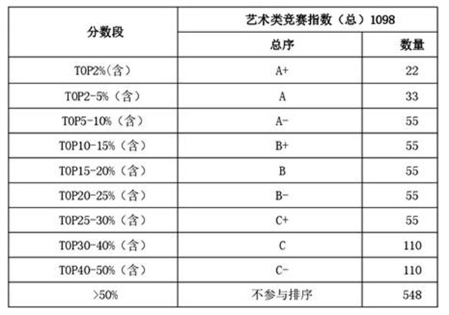 專(zhuān)家工作組以藝術(shù)類(lèi)相關(guān)專(zhuān)業(yè)的普通高校為主要對(duì)象,采集了25項(xiàng)高校藝術(shù)類(lèi)相關(guān)競(jìng)賽近三年共1155683條競(jìng)賽數(shù)據(jù),首輪指數(shù)覆蓋了25項(xiàng)全國(guó)普通高校大學(xué)生藝術(shù)競(jìng)賽,其中包含米蘭設(shè)計(jì)周等國(guó)內(nèi)外重點(diǎn)賽事。從獲獎(jiǎng)貢獻(xiàn)、參賽貢獻(xiàn)兩個(gè)維度構(gòu)建了評(píng)估模型,研發(fā)了藝術(shù)類(lèi)競(jìng)賽指數(shù),并劃分為A+、A、A-、B+、B、B-、C+、C、C-九個(gè)等級(jí)。