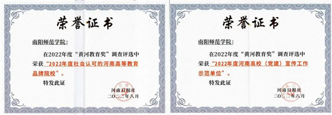 中新河南網(wǎng)9月10日電 近日,由河南日報社主辦的第十三屆“黃河教育論壇”暨“2022年度黃河教育獎”評選活動結(jié)果揭曉,南陽師范學(xué)院獲評“2022年度社會認可的河南高等教育品牌院校”和“2022年度河南高校(黨建)宣傳工作示范單位”。