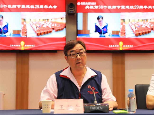 大會在莊嚴(yán)的《中華人民共和國國歌》中拉開帷幕。王新奇代讀王淑芳董事長賀辭。王淑芳董事長在賀辭中向全體教職員工表示親切的慰問和節(jié)日的祝福!她在賀詞中說,全體教師要努力擔(dān)當(dāng)起新時代“為黨育人,為國育才”的神圣使命,以“立德樹人”為根本任務(wù),按照“四有”好老師的標(biāo)準(zhǔn),努力拼搏,不斷進取,為黨和人民事業(yè)作出新的更大的貢獻。她對全體教師提三點希望:一是希望廣大教師要嚴(yán)謹(jǐn)治學(xué),持續(xù)重視教育教學(xué)質(zhì)量。走到天邊,質(zhì)量第一。要把創(chuàng)辦人的辦學(xué)理念和“五好”辦學(xué)原則,融入到高質(zhì)量人才培養(yǎng)全過程,要認(rèn)真做好、積極參與學(xué)校審核評估、專碩點培育等重大工作,提升辦學(xué)層次,不斷提高社會影響力和招生競爭力,更好的推進學(xué)校高質(zhì)量發(fā)展。二是希望廣大教師要為人師表,牢固樹立良好師德師風(fēng)。學(xué)校要建立長效機制,加強教育培訓(xùn),營造優(yōu)良風(fēng)氣。每位教職工都要做學(xué)生的表率、做老師的表率、做社會的表率,要按照“四有”好老師的標(biāo)準(zhǔn),以赤誠之心、奉獻之心、仁愛之心投身教育事業(yè)。三是希望廣大教師要熱愛學(xué)校,時刻助力學(xué)校建設(shè)發(fā)展。升達的建設(shè)和發(fā)展需要所有升達人的共同努力。讓我們同心同德,共同努力,克服困難,聚精會神干事業(yè),一心一意謀發(fā)展,努力把學(xué)校各項工作推向前進,努力取得新的更大的成績。