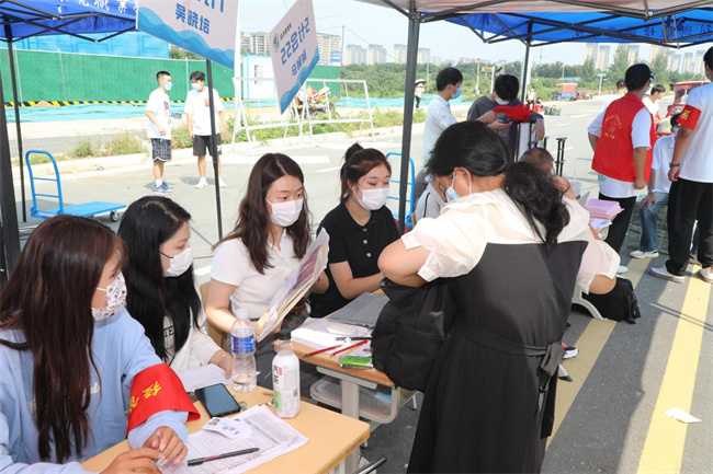 新生經(jīng)過測(cè)溫、掃碼、消殺等系列流程進(jìn)入學(xué)校。校內(nèi)設(shè)置核酸檢測(cè)點(diǎn),第一時(shí)間為到校新生提供核酸檢測(cè)服務(wù)。