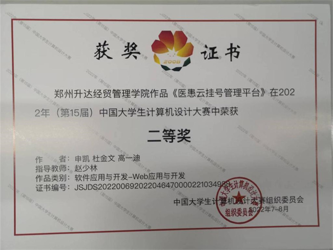 中新河南網(wǎng)9月19日電 (趙少林) 近日,2022年第15屆中國大學生計算機設(shè)計大賽全國總決賽正式落下帷幕。鄭州升達經(jīng)貿(mào)管理學院信息工程學院2019級計算機科學與技術(shù)專業(yè)申凱、杜金文、高一迪三位同學的作品《醫(yī)患云掛號管理平臺》參加了軟件應(yīng)用與開發(fā)組的全國總決賽,最終獲得全國二等獎1項。