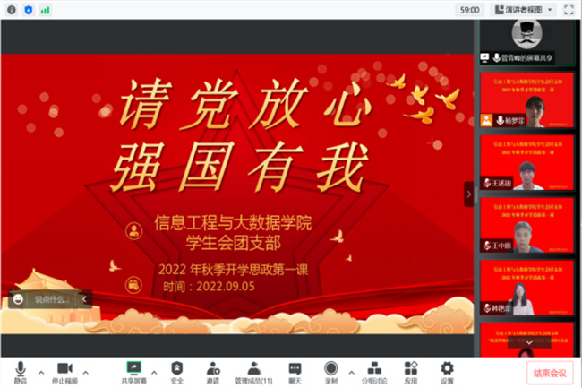 信息工程與大數(shù)據(jù)學院高度重視,并結(jié)合實際為學生帶來精彩的2022秋季開學思政第一課教育活動。本次活動主要結(jié)合黨課、團課,以線上線下授課為主。活動圍繞黨史學習教育講好初心使命,學習道德楷模人物講好青年擔當,結(jié)合抗疫主題教育講好中國故事,民族宗教政策法規(guī)筑牢共同意識等重點教育任務開展。