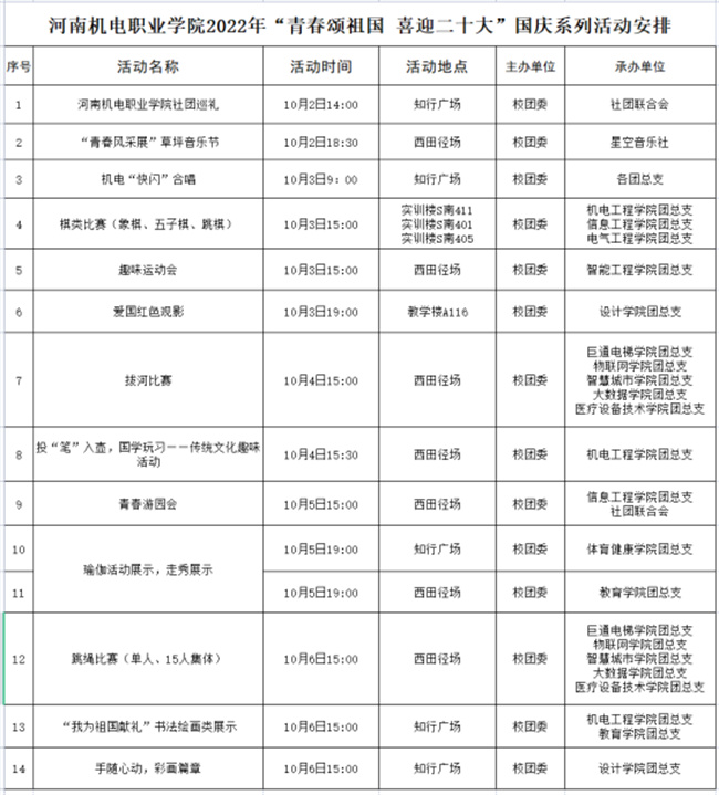 國(guó)慶假期期間,校團(tuán)委舉辦了“青春頌祖國(guó),喜迎二十大”慶祝中華人民共和國(guó)成立73周年系列活動(dòng),豐富了國(guó)慶期間校園文化生活,讓機(jī)電學(xué)子在活動(dòng)中歡度國(guó)慶。