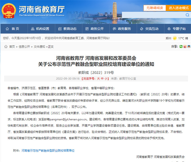 示范性產(chǎn)教融合型職業(yè)院校建設工作是河南省教育廳、河南省發(fā)展和改革委員會為進一步推進產(chǎn)教深度融合,優(yōu)化職業(yè)教育供給結構,發(fā)揮職業(yè)院校的示范帶動作用,在全省遴選出在產(chǎn)教協(xié)同育人、校企合作培養(yǎng)師資、學校治理體制機制創(chuàng)新、服務企業(yè)創(chuàng)新發(fā)展等方面卓有成效的職業(yè)院校,予以支持建設,是推動現(xiàn)代職業(yè)教育高質量發(fā)展的一項重要舉措。參評示范性產(chǎn)教融合型職業(yè)院校的學校,經(jīng)“自主申報、評審遴選、立項建設、驗收認定”后,將正式納入河南省示范性產(chǎn)教融合型職業(yè)院校名錄。