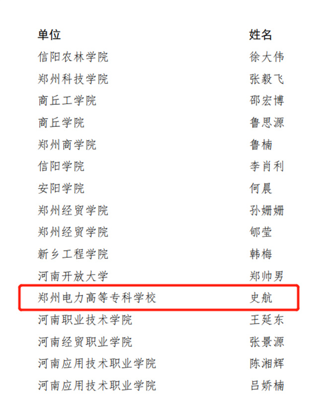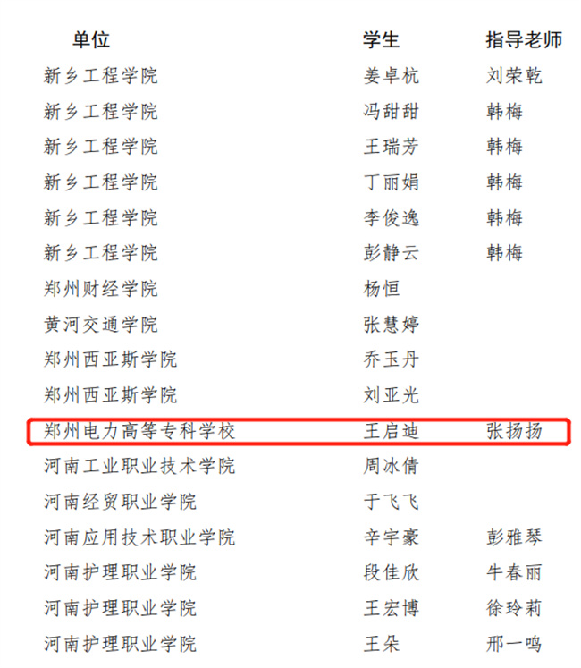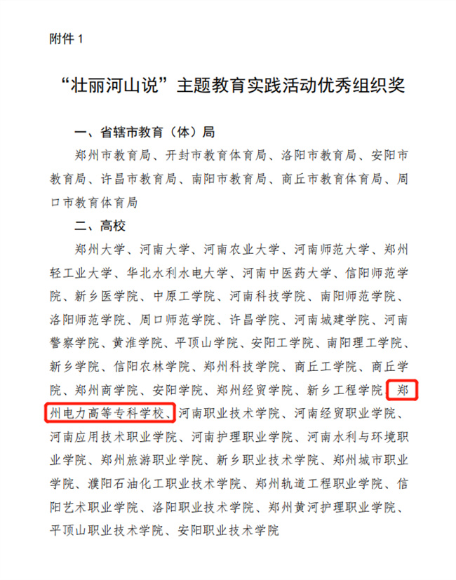 中新河南網(wǎng)10月23日電(王瑛潔) 近日,中共河南省委教育工委辦公室、河南省教育廳辦公室下發(fā)《關(guān)于公布“壯麗河山說”主題教育實(shí)踐活動獲獎結(jié)果的通知》,鄭州電力高等?茖W(xué)校榮獲“優(yōu)秀組織獎”,“先進(jìn)個人獎”、“人氣之星獎”、“優(yōu)秀指導(dǎo)教師”各有1人獲得。