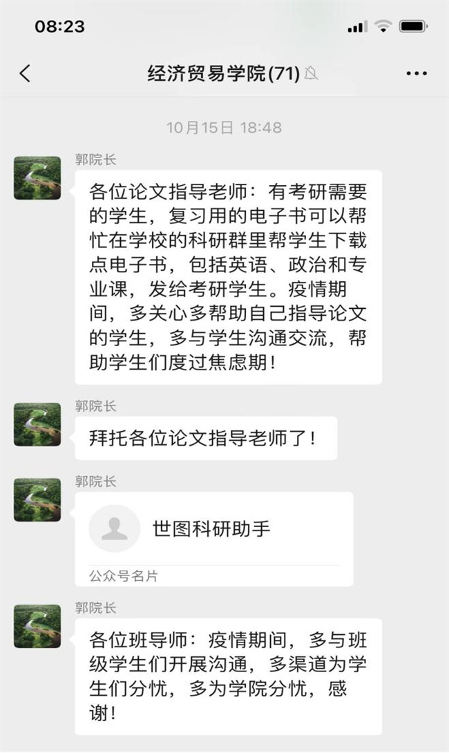 由于疫情來勢兇猛,讓相當(dāng)一部分同學(xué)措手不及,未能及時收拾學(xué)習(xí)資料,許多學(xué)生的學(xué)習(xí)資料都落在了圖書館、教學(xué)樓等處。院長郭凱在關(guān)心住校老師們的同時,迅速組織所有班導(dǎo)師和論文指導(dǎo)教師,要求線上對同學(xué)們尤其是考研學(xué)生進行針對性的專業(yè)指導(dǎo)。針對考研同學(xué)學(xué)習(xí)資料不在宿舍的情況,郭院長為同學(xué)們提供了多種獲得電子資料的渠道,緩解考研同學(xué)的焦慮情緒。