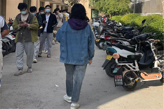 他們在宿舍園區(qū)的道路上進行巡邏,時刻檢查著學(xué)生們的疫情防護情況。志愿者們紅色的背影,形成了一道亮麗的風(fēng)景線。