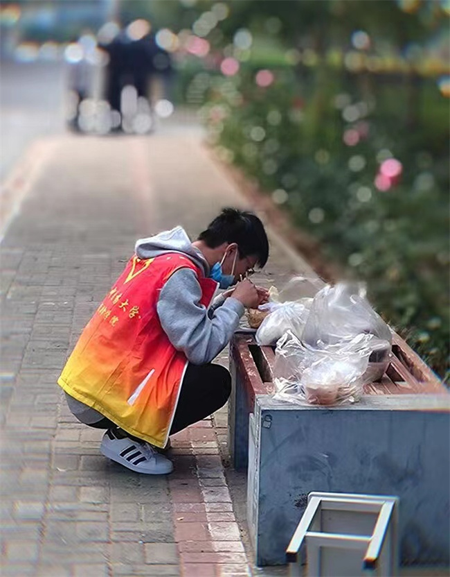 相信光、追著光、才能成為光。在校領(lǐng)導(dǎo)的關(guān)懷呵護(hù)下,在學(xué)院、書院領(lǐng)導(dǎo)、老師們的言傳身教下,廣大河中醫(yī)學(xué)子以實(shí)際行動(dòng),身體力行參與校園疫情防控,以青春之名,描繪戰(zhàn)“疫”風(fēng)景線。晨曦初露,天剛放亮,校園第一批學(xué)生志愿者已經(jīng)穿上紅馬甲,在食堂、核酸檢測(cè)點(diǎn)等地,協(xié)助老師們完成各項(xiàng)工作。“請(qǐng)戴好口罩,保持一米距離……”一個(gè)小時(shí)下來,志愿者的嗓子都啞了。主動(dòng)請(qǐng)纓擔(dān)當(dāng)“送餐員”的學(xué)生志愿者們馬不停蹄地穿梭于樓上樓下,盡可能地縮短送餐時(shí)間,只為了能讓同學(xué)吃上熱的飯菜。微寒的十月,汗水卻濕透了衣背。在校園里,像這樣無私奉獻(xiàn)、毫無怨言的學(xué)生志愿者們還有很多很多。