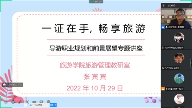 旅游學(xué)院 旅游管理教研室組織旅游管理專(zhuān)業(yè)、酒店數(shù)字化運(yùn)營(yíng)與管理、民宿運(yùn)營(yíng)管理專(zhuān)業(yè),開(kāi)展“一證在手,暢享旅游——導(dǎo)游職業(yè)規(guī)劃和前景展望”的交流互動(dòng)。從導(dǎo)游員資格證的地位作用、考試形式、備考方法、智慧旅游、文博旅游、在線(xiàn)旅游等方面,對(duì)導(dǎo)游職業(yè)場(chǎng)景和職業(yè)生涯發(fā)展做分享。通過(guò)師生交流分享,拓寬了專(zhuān)業(yè)視野、了解了前沿趨勢(shì),學(xué)生對(duì)智慧旅游、云旅游、智慧文博、在線(xiàn)導(dǎo)游等新業(yè)態(tài)都有了深刻的認(rèn)識(shí)。