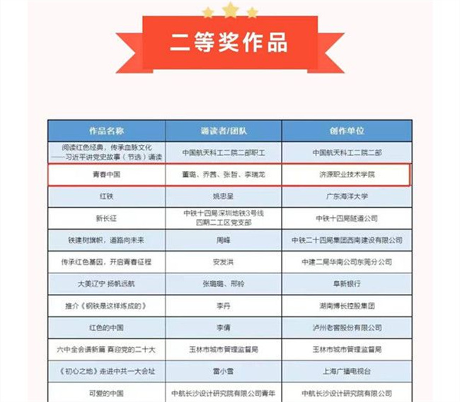 中新河南網(wǎng)11月15日電(段飛) 近日,由中華全國(guó)總工會(huì)、中央網(wǎng)信辦主辦的2022年“網(wǎng)聚職工正能量 爭(zhēng)做中國(guó)好網(wǎng)民”主題活動(dòng)之“閱讀經(jīng)典好書(shū) 爭(zhēng)做中國(guó)好網(wǎng)民’主題誦讀作品征集活動(dòng)評(píng)選結(jié)果正式公布。由河南省總工會(huì)推薦的濟(jì)源職業(yè)技術(shù)學(xué)院誦讀作品《青春中國(guó)》從近3000部作品中脫穎而出入選前100名優(yōu)秀作品榜單并榮獲全國(guó)二等獎(jiǎng)。