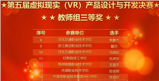 據(jù)悉,大賽以虛擬現(xiàn)實(shí)、人人開發(fā)為主題,分為高校學(xué)生組、中職學(xué)生組、教師組三個(gè)組別。來(lái)自全國(guó)50余所職業(yè)院校的81支參賽隊(duì)伍200余名參賽選手參賽。教師組競(jìng)賽內(nèi)容包括命題開發(fā)階段、指定功能開發(fā)階段(實(shí)操)、VR開發(fā)作品答辯三個(gè)階段。