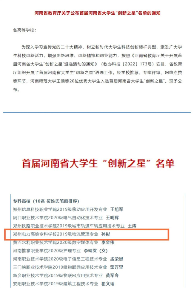 今年5月,河南省教育廳啟動首屆河南省大學生“創(chuàng)新之星”遴選活動。經過學院初選、學校復選、省教育廳材料復審、網絡投票、專家評審、公示等環(huán)節(jié),孫彬同學以其自強不息、勇于創(chuàng)新、勵志奮進的創(chuàng)新創(chuàng)業(yè)精神,在學術科技創(chuàng)新方面突出成績,取得的具有示范、帶動、輻射作用科技創(chuàng)新成果,斬獲了首屆河南省大學生“創(chuàng)新之星”榮譽。
