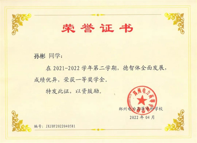 孫彬,鄭州電力高等?茖W校經濟管理學院2022屆物流管理專業(yè)畢業(yè)生,現就職于河南九域恩湃電力技術有限公司。2022年11月獲評首屆河南省大學生“創(chuàng)新之星”