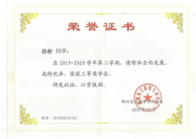 2019年,孫彬被錄取到鄭州電力高等專科學校經濟管理學院物流管理專業(yè)。他積極上進,勇于擔當,作為新時代的青年大學生,他立志成為能夠擔當民族復興大任的時代新人。在校期間,他在思想上始終嚴格要求自己,不斷加強自身的政治理論學習,擔任班級宣傳委員職務期間,他始終堅定正確的政治方向,擁護黨的各項方針政策,擁有創(chuàng)新精神,積極將自己的創(chuàng)新思想與同學和老師們分享。他說:“只有心中有信仰,才能知道自己腳下路的方向;只有心中有信念,才能無懼創(chuàng)新路上的荊棘坎坷。”