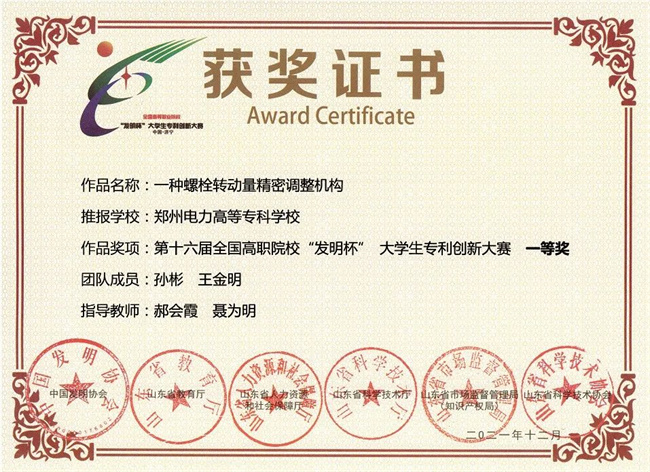 獲得第十六屆全國高職院校“發(fā)明杯”專利創(chuàng)新大賽國賽一等獎(排名第一)